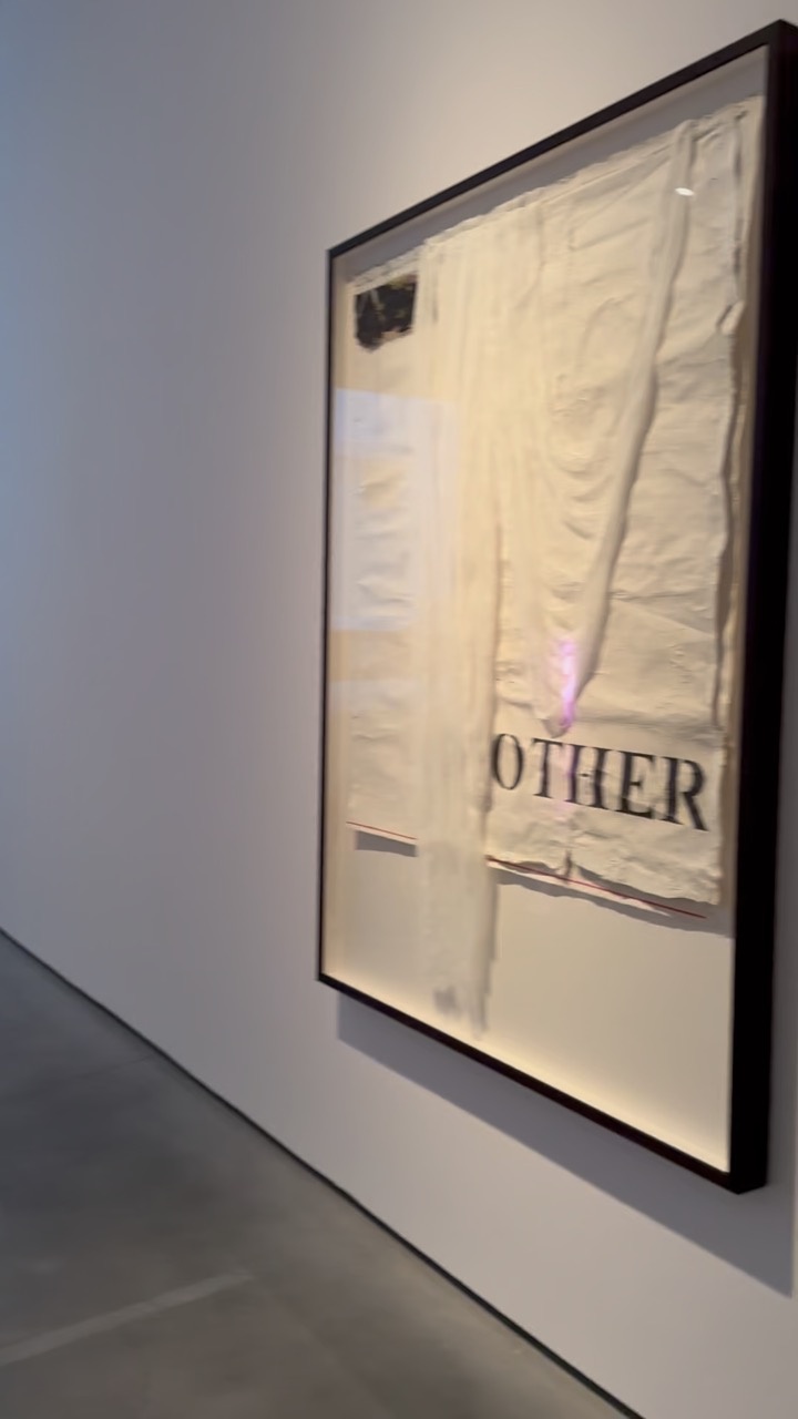 The image showcases a minimalist gallery space with smooth, light-colored walls that create a serene and contemplative atmosphere. A framed artwork hangs prominently, featuring layered textiles with a mix of textures. The fabric is draped and partially obscures the word 'OTHER,' adding an element of intrigue and depth. The lighting is soft and diffused, casting gentle shadows that enhance the textures of the fabric. The polished concrete floor reflects the subtle light, contributing to the modern and airy feel of the space, reminiscent of the tranquil and artistic ambiance often found in Mallorca's cultural venues.
