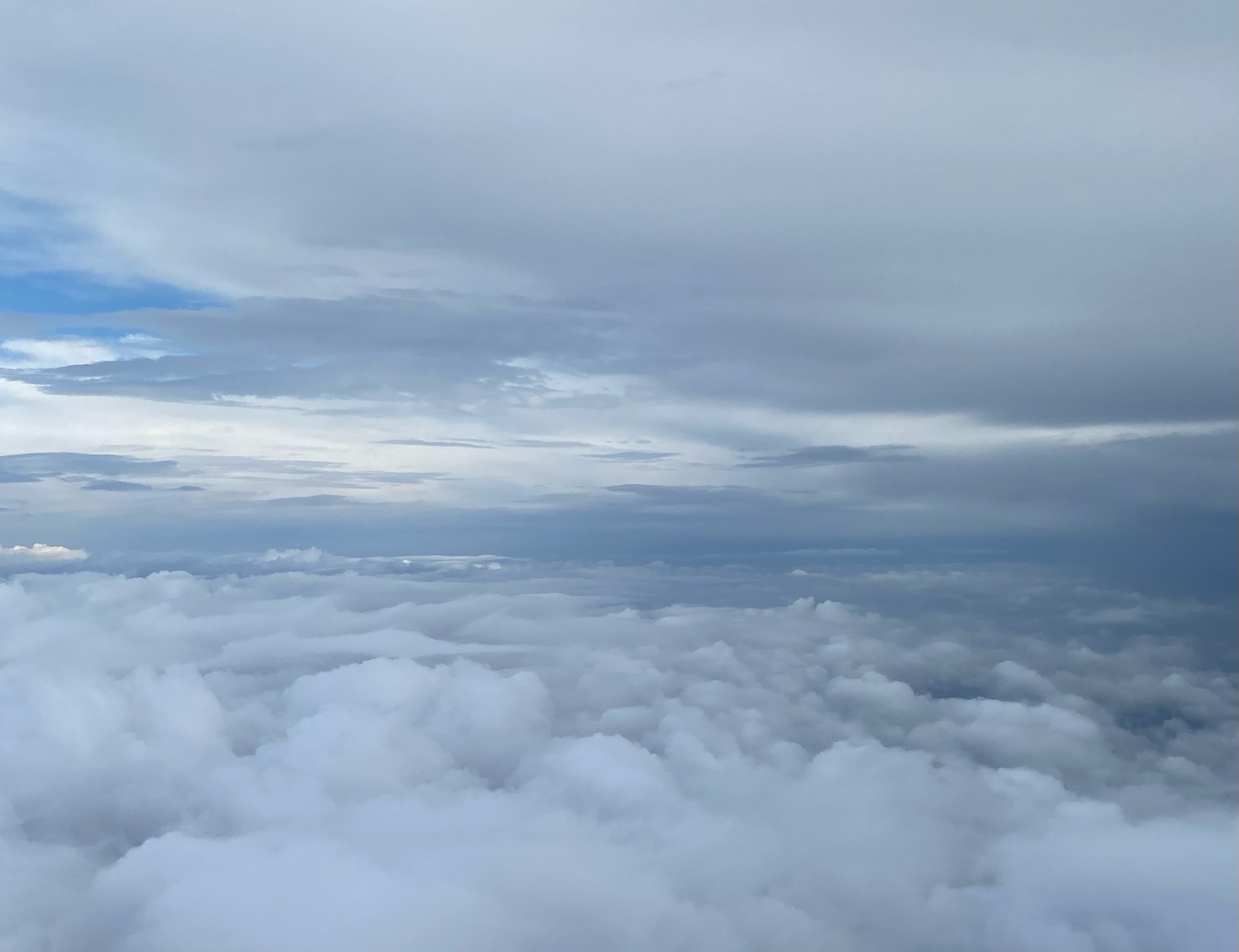 A vast expanse of fluffy, white clouds stretches across the scene, creating a soft, ethereal landscape. The cloud tops are illuminated by diffused sunlight, casting gentle shadows and highlights that add depth to the view. Above, the sky transitions from a pale blue to a deeper, more muted hue, with streaks of gray clouds hinting at the possibility of changing weather. The atmosphere is serene and expansive, evoking a sense of calm and tranquility, reminiscent of the peaceful skies over Mallorca.