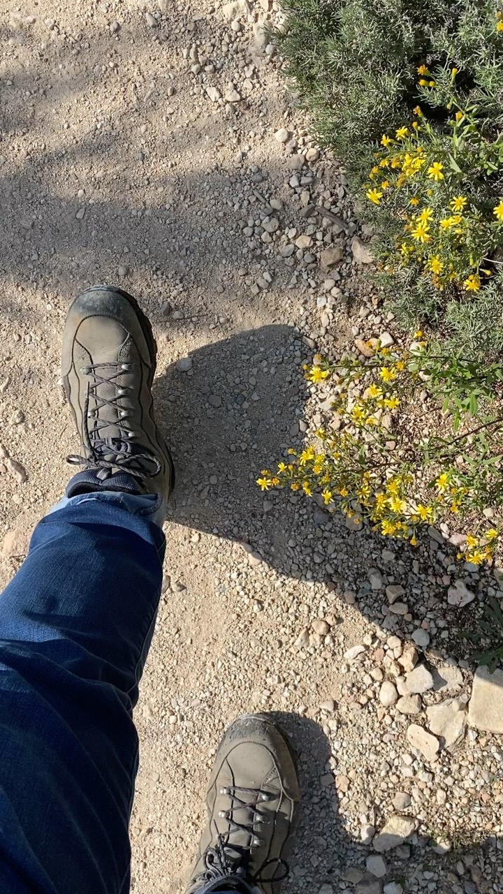 The image captures a sunlit path in Mallorca, where a pair of sturdy hiking boots tread on a textured, dusty trail. The ground is scattered with small stones and pebbles, casting subtle shadows under the bright sunlight. To the side of the path, vibrant yellow wildflowers bloom amidst the greenery, adding a splash of color to the earthy tones. The scene evokes a sense of adventure and tranquility, typical of a leisurely walk through Mallorca’s natural landscapes.