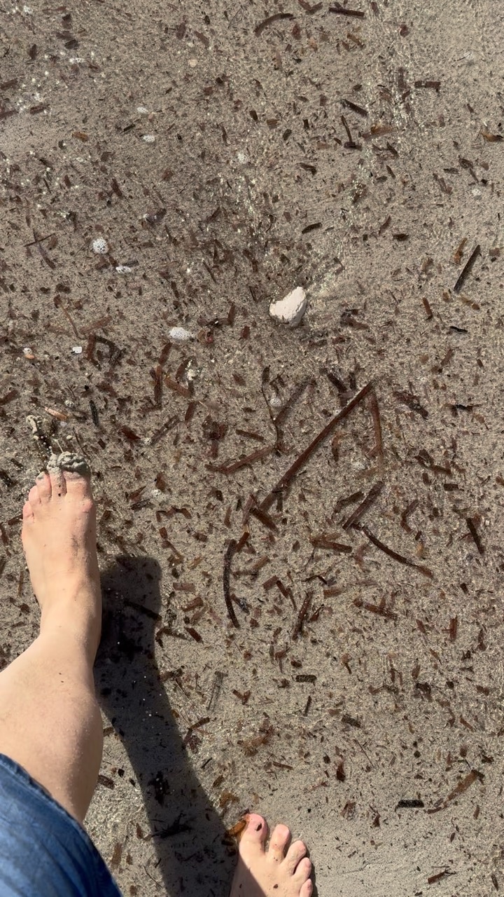 A sunlit sandy beach in Mallorca is captured with a close-up view of a person's bare feet walking along the shore. The sand is textured with scattered dried seaweed and small shells, creating a natural mosaic underfoot. The warm sunlight casts soft shadows, enhancing the earthy tones of the sand and seaweed. The scene exudes a tranquil, leisurely atmosphere typical of a Mediterranean coastal setting, inviting a sense of relaxation and connection with nature.