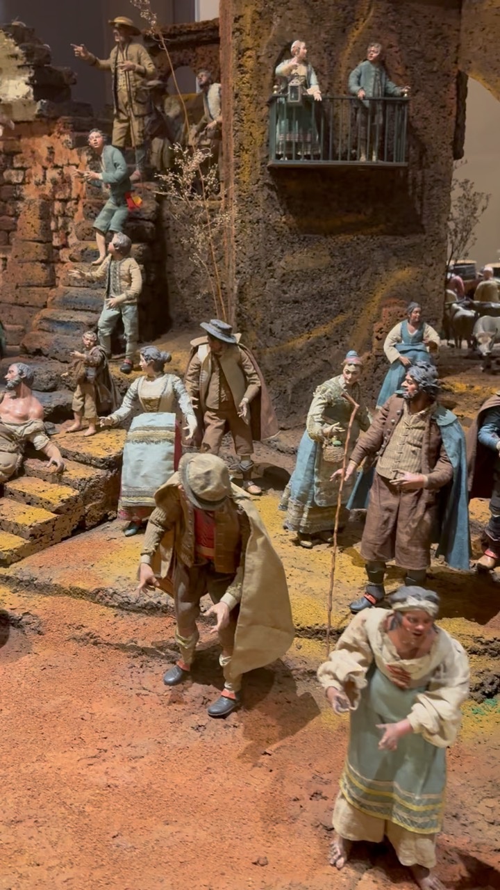 The photo depicts a detailed diorama scene with numerous small figurines arranged in a historical or rustic setting. The figures are dressed in period clothing, suggesting a historical or rural village scene. The mood is lively, with various characters engaged in different activities, creating a bustling atmosphere. The background features a stone structure and steps, adding depth and context to the scene. The craftsmanship of the figurines and the setting indicates a high level of detail and artistic effort.